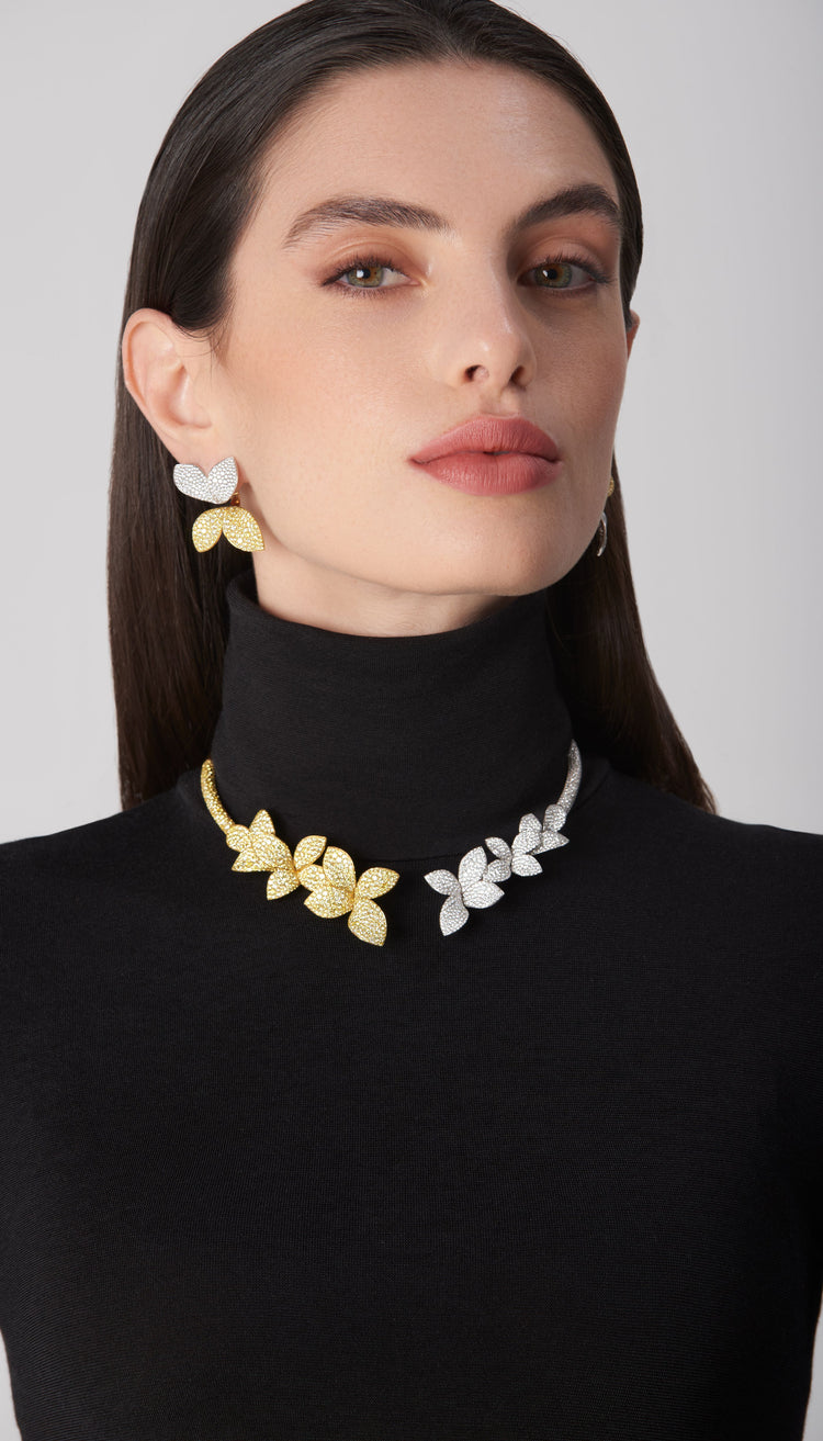 Giardini Segreti Aura illuminates the eye of the beholder thanks to the light emanating from the jewel, which is delicate yet striking. The yellow diamond pave increases in volume and matches the yellow gold, giving the jewel a new power.