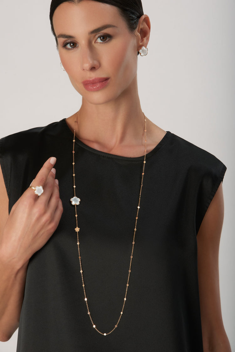 In its gems, there is the poetry of pink quartz, the stone of eternal Love, the embrace between heaven and sea of chalcedony, the sensual lunar candor of milky quartz, the earthly warmth of brown quartz, all made unique by the beauty of the patented and iconic Bon Ton cut characterized by the soft irregular facets of the 5 petals which design a cabochon pistil in the heart of the stone. The joyous light of the gems vibrate on the skin enhanced by the diamonds surrounding the flowers. The body feels its energy and seduces with infinite purity.