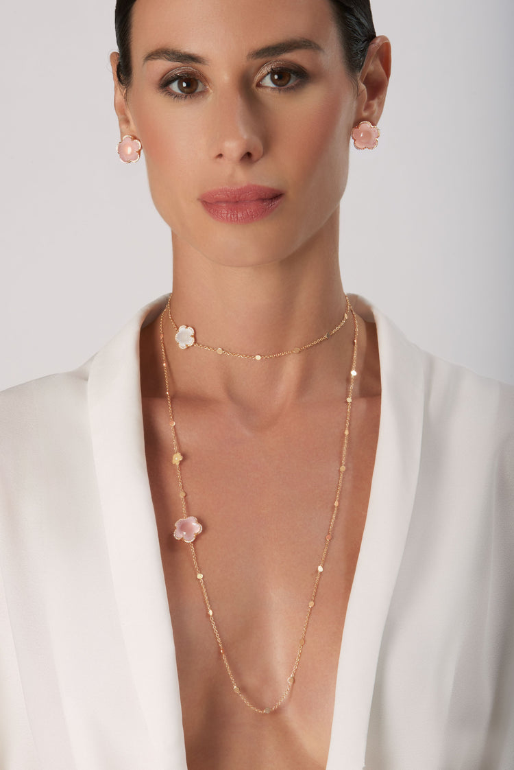 In its gems, there is the poetry of pink quartz, the stone of eternal Love, the embrace between heaven and sea of chalcedony, the sensual lunar candor of milky quartz, the earthly warmth of brown quartz, all made unique by the beauty of the patented and iconic Bon Ton cut characterized by the soft irregular facets of the 5 petals which design a cabochon pistil in the heart of the stone. The joyous light of the gems vibrate on the skin enhanced by the diamonds surrounding the flowers. The body feels its energy and seduces with infinite purity.