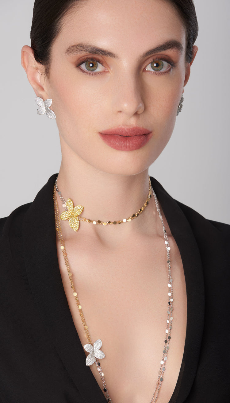 Giardini Segreti Aura illuminates the eye of the beholder thanks to the light emanating from the jewel, which is delicate yet striking. The yellow diamond pave increases in volume and matches the yellow gold, giving the jewel a new power.
